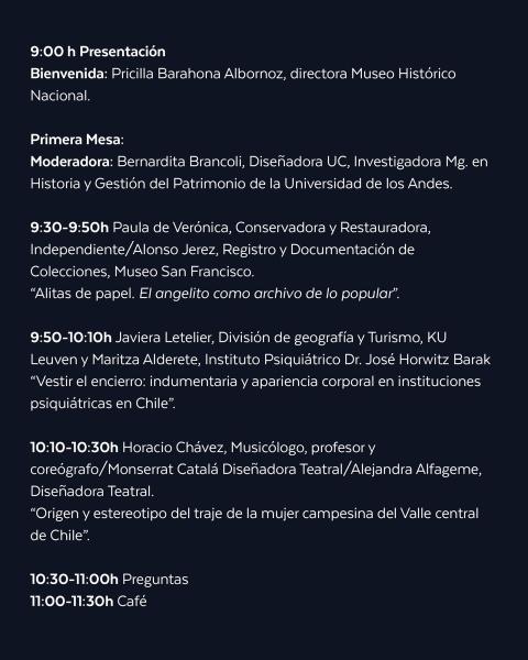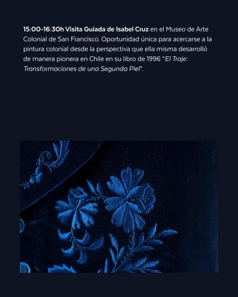 15:00 a 16:30 h. Visita guiada de Isabel Cruz en el Museo San Francisco. Oportunidad única para acercarse a la pintura colonial desde la perspectiva que ella misma desarrolló de manera pionera en Chile en su libro de 1996 "El traje: transformaciones de una segunda piel".